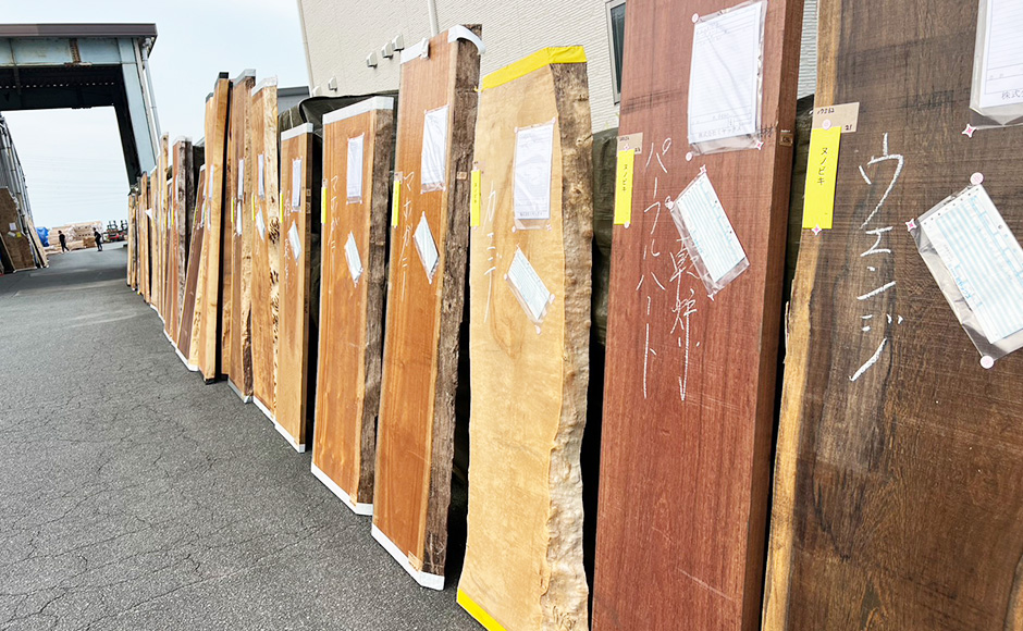 レジンテーブルの魅力を最大限に引き出すため、一流の木材を厳選。地元産の木材を職人が見極めて目利きします。