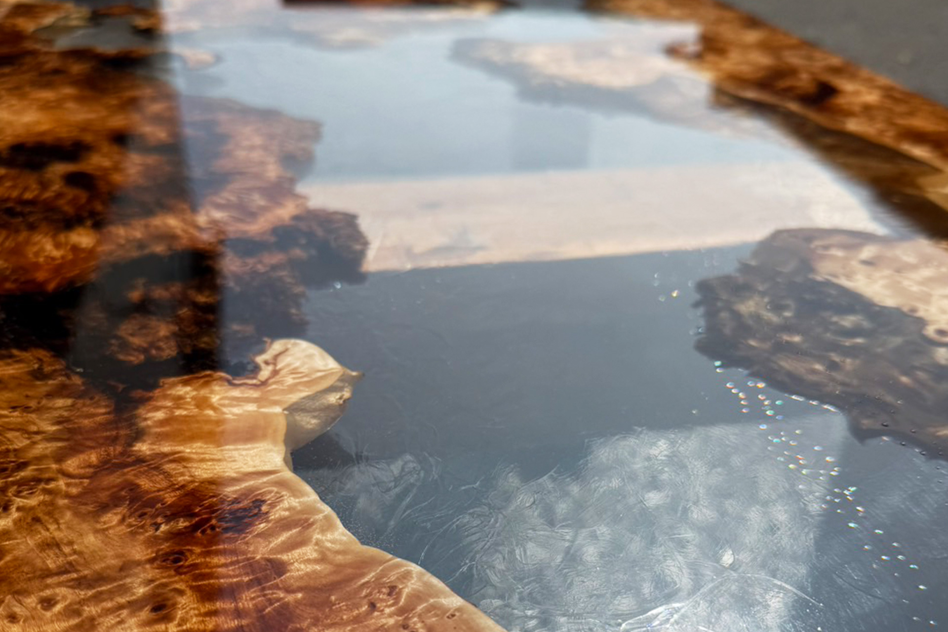 無垢の木材を活かし、レジンで加工することにより、透明度の高い艶が出て「魅力あるテーブル」に仕上がります。